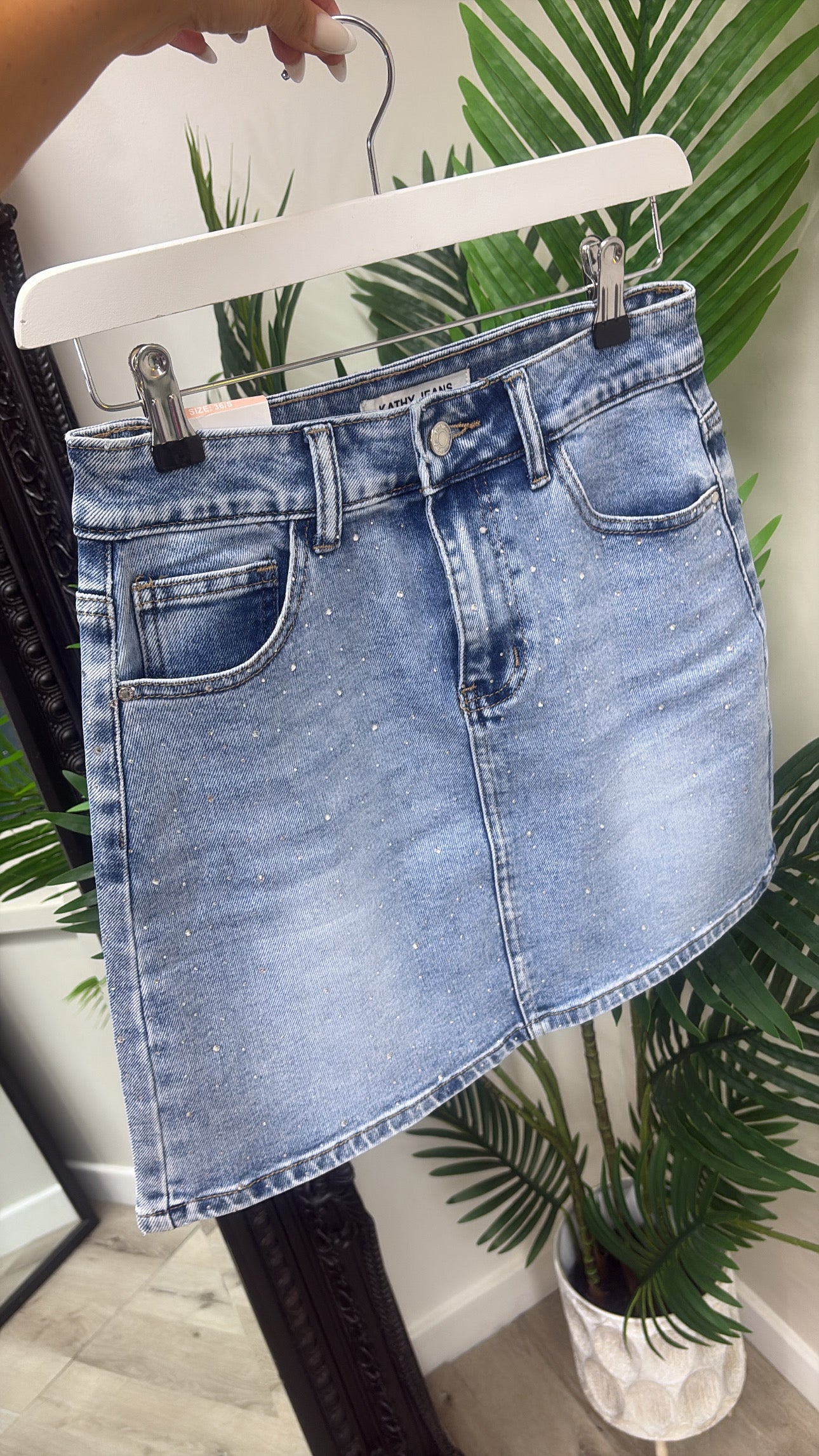 Absolutely stunning! Stretchy style denim skirt. Bling detail.